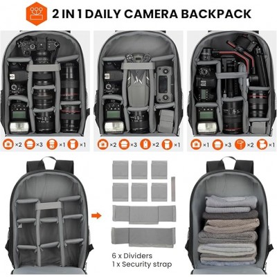 【Multifuncional】 La parte inferior de esta mochila fotográfica con 2 correas, útil para transportar trípode o cámara única. Esta mochila de la cámara se puede convertir fácilmente en una mochila o en una bolsa escolar eliminando las 6 tareas del compartimento de la cámara.