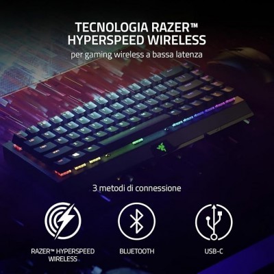 3 metodi di connessione tramite Razer HyperSpeed (Wireless 2 4 GHz), Bluetooth o USB-C: Passa facilmente da gaming wireless a bassa latenza al Bluetooth, che ti permette di connettere fino a 3 dispositivi Include un cavo USB-C separato per la carica durante l'uso